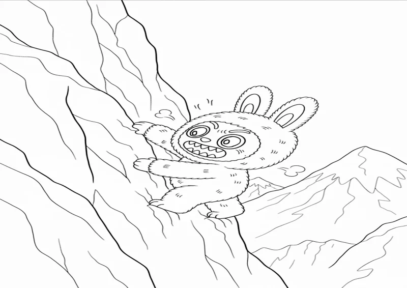 🐻LabubuLabubu sobe com esforço uma montanha, escorregando e voltando a agarrar o gelo