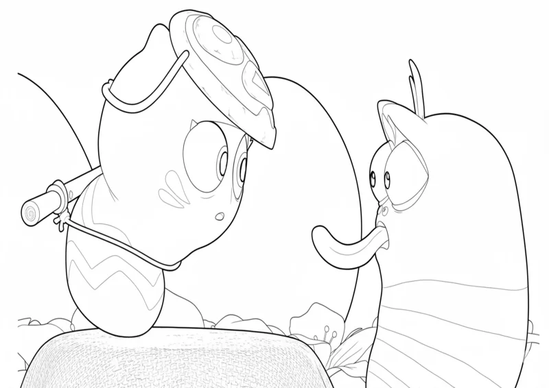 🌋Larva IslandDesenho inspirado em Larva Island mostrando Red e Pin em uma cena engraçada Red com um balde na cabeça e Pin com expressão surpresa. Arte divertida e detalhada, ideal para livros e atividades de colorir infantis.