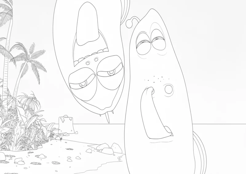 🌋Larva IslandDesenho inspirado em Larva Island mostrando os personagens Red e Yellow em uma cena divertida na praia. A dupla aparece com expressões engraçadas, destacando o humor e a amizade que marcam suas aventuras na ilha tropical.