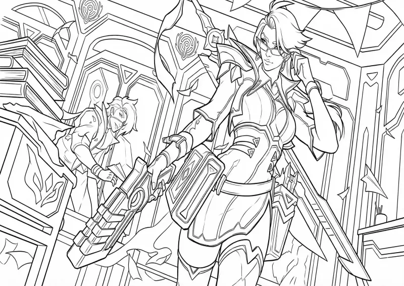 🧙🏽♂️🎮 League of legendsDesenho detalhado da skin Samira Academia de Batalha (Battle Academia) de League of Legends. A atiradora é retratada como uma professora ou estudante de elite, usando óculos estilosos e seu uniforme da academia, enquanto segura sua enorme espada-pistola com confiança. O cenário de fundo é uma biblioteca ou sala de aula, com estantes de livros e bandeirolas festivas. Ao fundo, pode-se ver outro estudante (possivelmente Ezreal) correndo. A arte possui traços limpos e foco na expressão desafiadora de Samira, perfeita para fãs da linha de skins escolares.