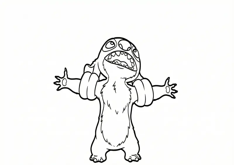 👽Lilo e StitchDesenho em arte linear (line art) preto e branco do personagem Stitch. A imagem mostra Stitch em pé com uma expressão empolgada, olhando para cima e com a boca aberta, mantendo os braços bem abertos. Ele está usando boias infláveis nos braços (ou ao redor do pescoço), sugerindo um cenário de praia ou piscina. O traço é nítido, sem preenchimento e com fundo branco, ideal para impressão e pintura.