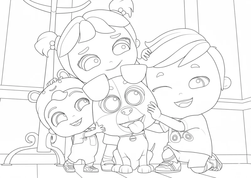 👼Little AngelDesenho para colorir inspirado em Little Angel mostrando as crianças abraçando e brincando com seu cachorro de estimação. Uma cena divertida e fofa que transmite amizade, amor pelos animais e alegria em família. Ideal para imprimir e colorir, estimulando a imaginação das crianças.