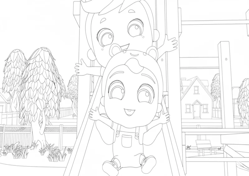 👼Little AngelDesenho para colorir inspirado em Little Angel mostrando dois irmãos se divertindo no escorregador do parquinho. Uma cena alegre e cheia de energia, perfeita para estimular a criatividade das crianças e ensinar o valor da amizade e da diversão em família. Ideal para imprimir e colorir.