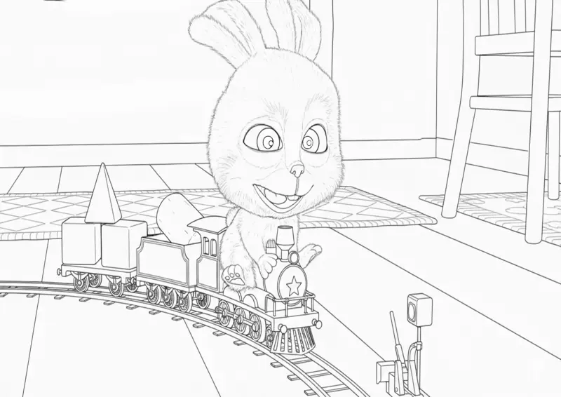 👧Masha e o UrsoDesenho para colorir apresentando o personagem Coelho se divertindo com um trenzinho de brinquedo em um cenário doméstico. O trem carrega blocos geométricos e uma cenoura gigante, enquanto percorre um trilho montado sobre o tapete da sala, proporcionando uma cena rica em detalhes para as crianças pintarem.