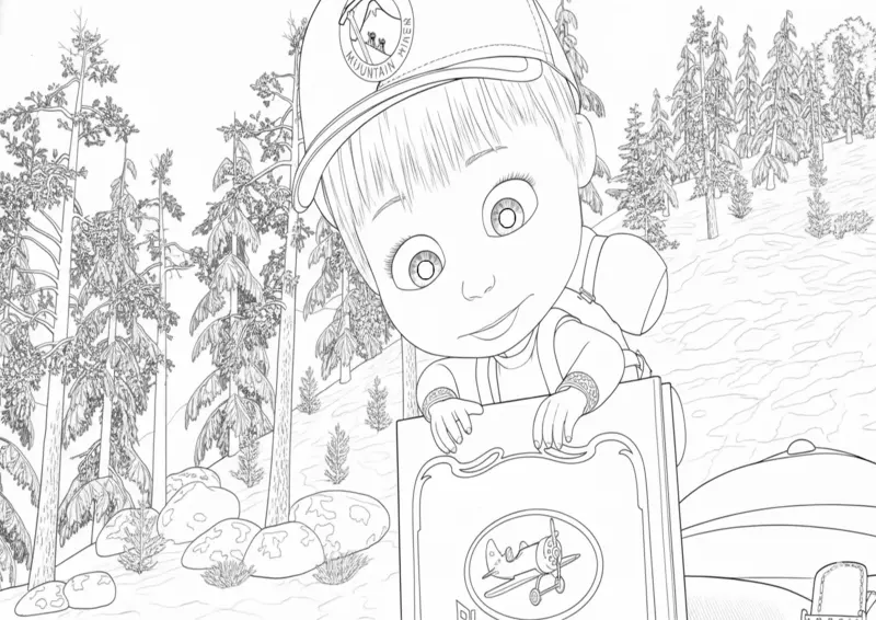 👧Masha e o UrsoDesenho para colorir da Masha em modo aventureira, usando um boné de "Mountain Hiker" (alpinista) e mochila. Ela aparece segurando um livro com a ilustração de um avião na capa, em um cenário de floresta montanhosa com pinheiros e pedras ao fundo.