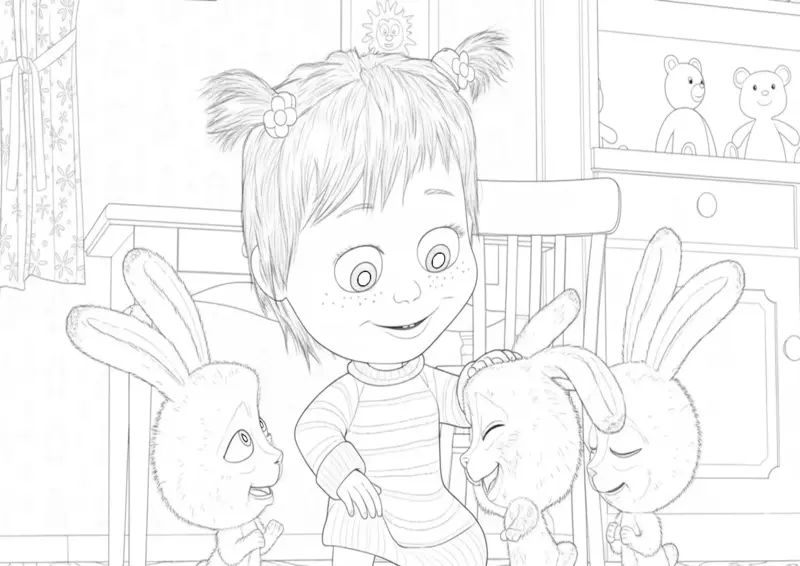 👧Masha e o UrsoDesenho para colorir da personagem Masha interagindo alegremente com três coelhinhos dentro de casa. A cena mostra Masha com seu penteado de marias-chiquinhas, sorrindo e fazendo carinho nos animais, em um ambiente detalhado com prateleiras e brinquedos ao fundo.