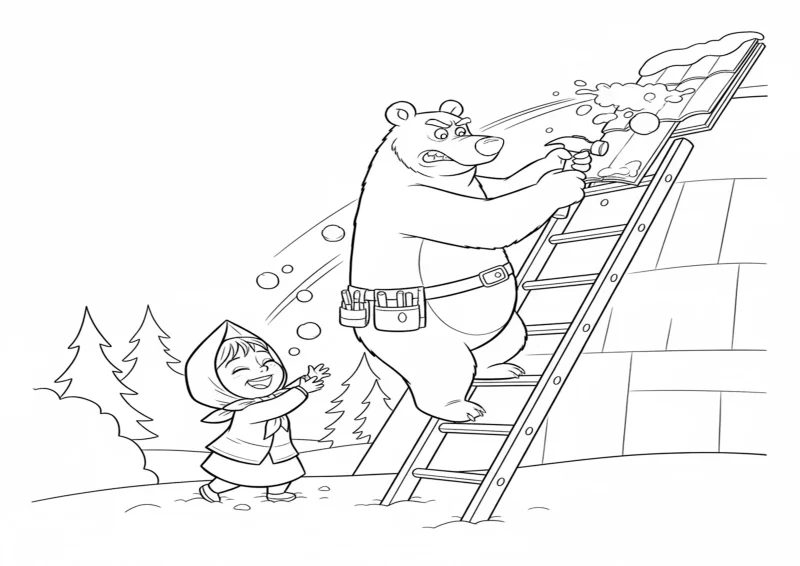 👧Masha e o UrsoO Urso sobe em uma escada consertando telhas no telhado. Do chão, Masha joga bolas de neve nele rindo. O Urso segura o martelo bravo.