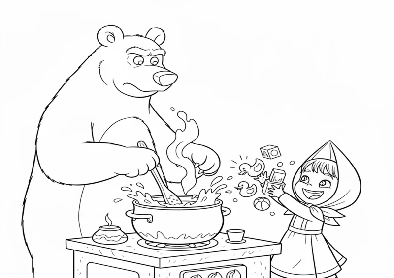 👧Masha e o UrsoO Urso mexe uma grande panela de sopa em cima do fogão. Atrás, Masha joga brinquedos dentro da panela sorrindo. O Urso olha assustado e bravo.