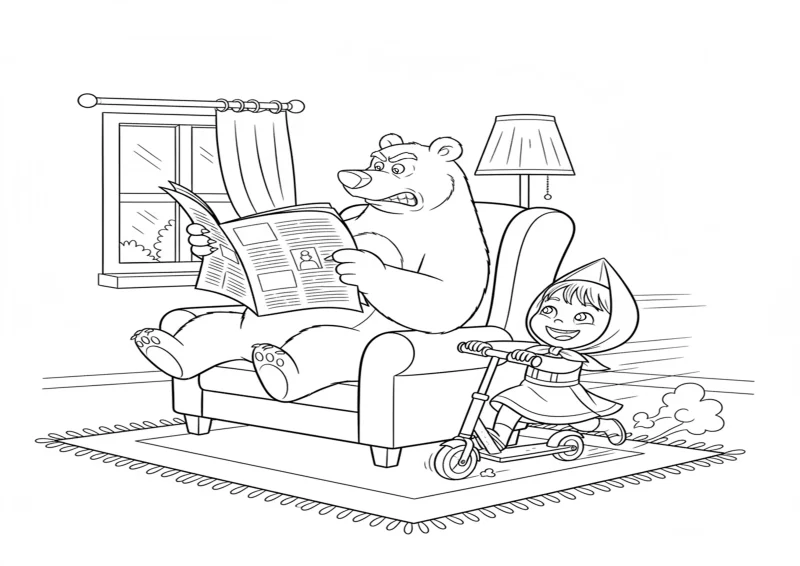 👧Masha e o UrsoO Urso sentado em uma poltrona tentando ler um jornal. Masha passa de patinete pela sala quase batendo nele. O jornal balança com o vento e o Urso faz cara de bravo.