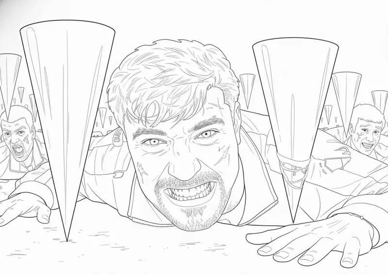 😎MrBeastDesenho detalhado para colorir do MrBeast e seus amigos enfrentando desafios. A imagem captura a expressão de esforço e adrenalina de Jimmy Donaldson enquanto rasteja, inspirada em seus vídeos de jogos de sobrevivência reais.