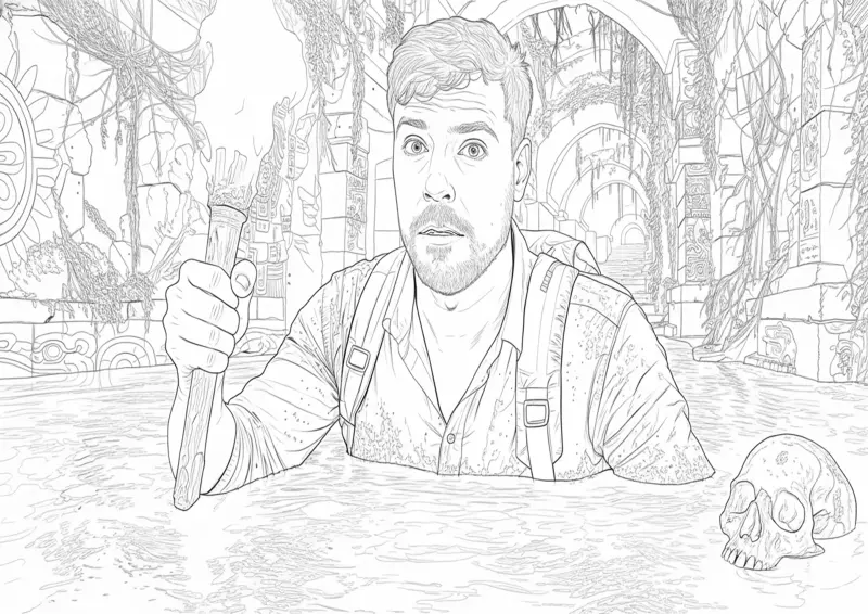 😎MrBeastDesenho de linha do Youtuber MrBeast em uma aventura de exploração arqueológica. A ilustração apresenta Jimmy Donaldson segurando uma tocha dentro de um templo antigo inundado, com hieróglifos, vegetação e uma caveira, capturando o espírito de mistério e aventura de seus desafios.