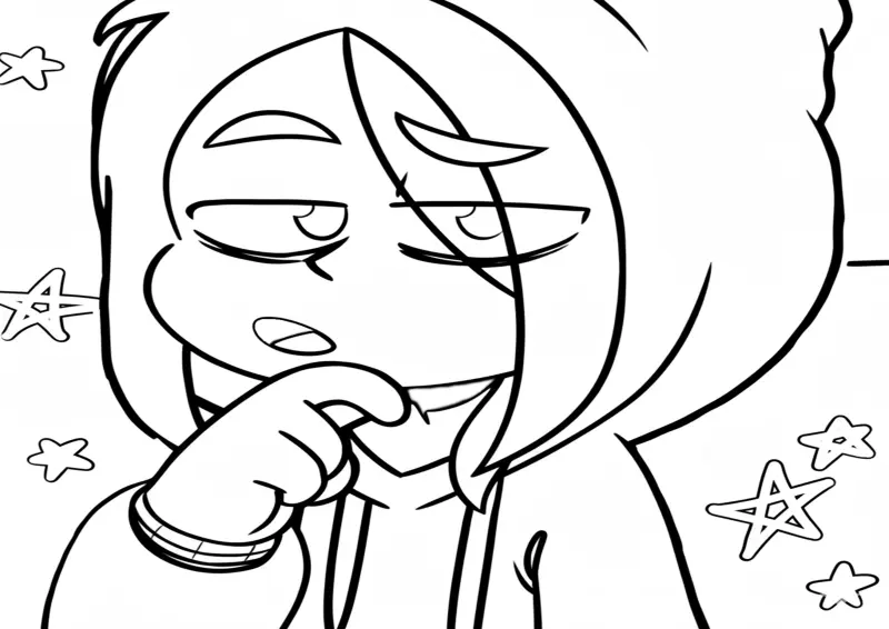 ✌️Mundo do TorajoUm desenho detalhado em lineart da personagem Linn, do Mundo do Torajo, em um momento pensativo cercada por estrelas. Esta ilustração em preto e branco destaca o estilo único da Linn com seu capuz, sendo ideal para fãs que buscam imagens expressivas para colorir ou para usar como base em artes digitais.