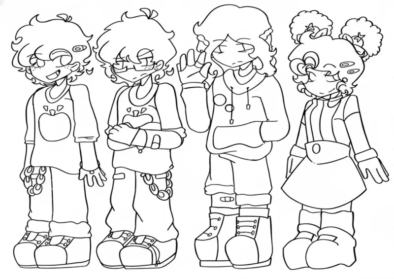 ✌️Mundo do TorajoDesenho linear dos personagens Torajo, Morajo, Linn e Zulmi em pé, exibindo seus visuais completos. Esta ilustração do Mundo do Torajo é perfeita para quem deseja praticar pintura digital ou imprimir para colorir, destacando os detalhes das roupas e o design único de cada integrante da turma.
