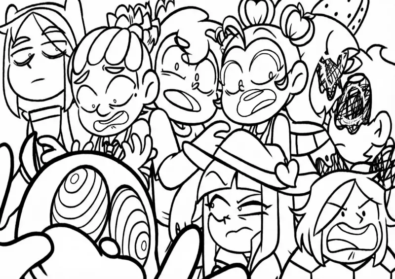✌️Mundo do TorajoDesenho em preto e branco (lineart) detalhado mostrando todos os personagens principais do "Mundo do Torajo" aglomerados em uma cena de caos e reações intensas. Em primeiro plano, Abel aparece com os olhos em espiral, parecendo hipnotizado ou tonto. Atrás dele, o grupo reage de formas diferentes: Linn está apático segurando uma bebida, Jay e Zulmi parecem aterrorizados, Morajo está chocado, Pessy exibe uma expressão de deboche ou irritação e Torajo aparece gritando furioso no canto. Há também uma figura misteriosa com o rosto rabiscado ao fundo.