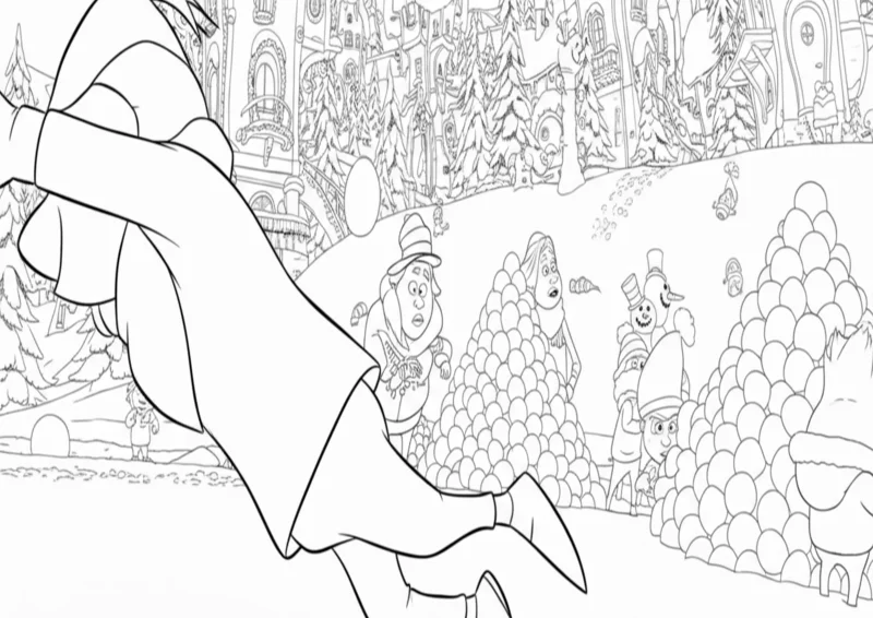 🎄O GrinchDesenho para colorir da vila de Quemlândia (Whoville) durante uma divertida batalha de bolas de neve. A imagem mostra os Quem (Whos) interagindo em um cenário rico em detalhes, com casas decoradas, árvores de natal e grandes pilhas de neve, ideal para quem busca uma atividade de colorir complexa e temática do filme O Grinch.