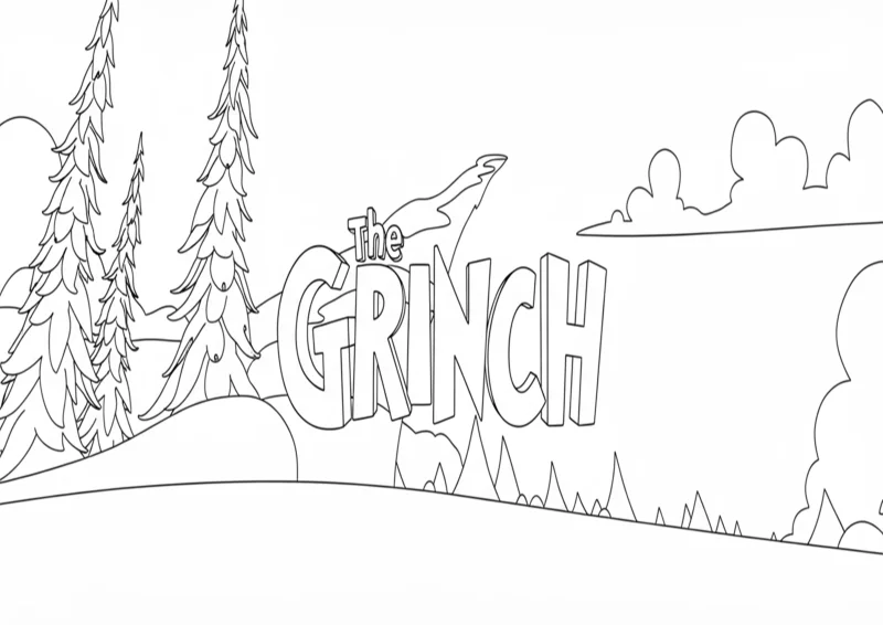 🎄O GrinchDesenho para colorir apresentando o logotipo oficial de The Grinch em destaque sobre a paisagem gelada da Montanha Crumpit. A cena inclui os pinheiros cobertos de neve e o horizonte nublado da vizinhança de Quemlândia, perfeito para criar capas de cadernos de atividades ou artes temáticas de Natal.