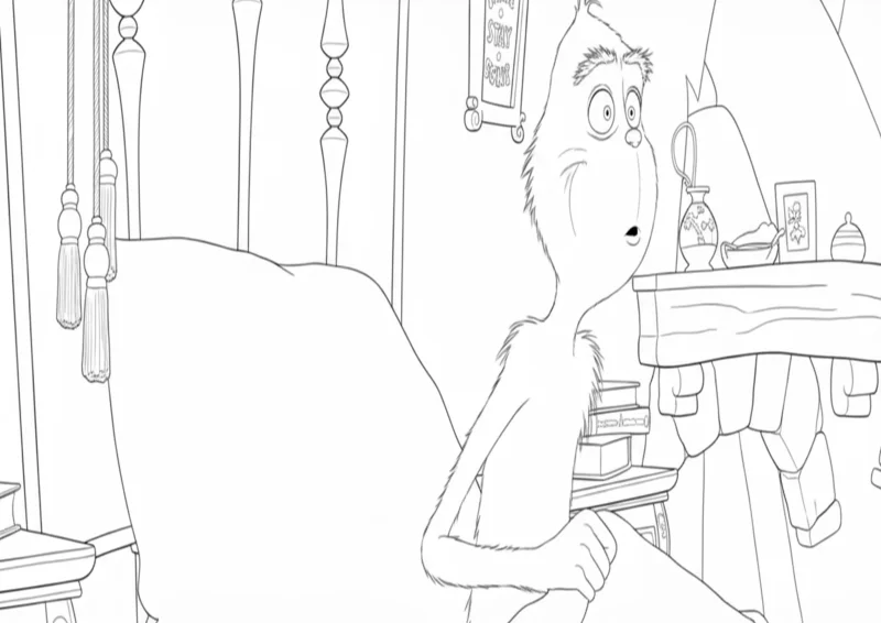 🎄O GrinchDesenho para colorir do Grinch com uma expressão de surpresa ao despertar em seu quarto na Montanha Crumpit. A ilustração detalha elementos icônicos do cenário, como a lareira de pedra, livros empilhados e a decoração rústica, oferecendo uma atividade rica em detalhes para fãs de todas as idades.