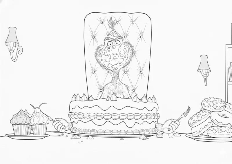 🎄O GrinchDesenho para colorir do Grinch sentado à mesa, escondido atrás de um enorme bolo confeitado, cupcakes e donuts. Esta cena divertida captura o apetite peculiar do personagem na Montanha Crumpit, oferecendo muitos detalhes de confeitaria para colorir, ideal para crianças e fãs que buscam atividades de Natal criativas.