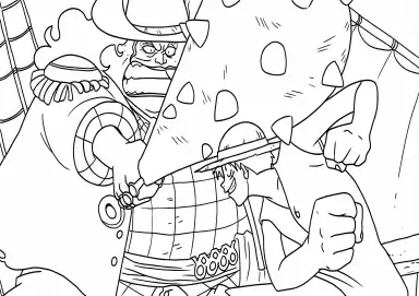 👒One PieceUma ilustração de ação vibrante retratando o confronto clássico entre Monkey D. Luffy e Alvida. O desenho captura o momento exato em que Alvida desfere um golpe poderoso com sua enorme clava de ferro com espinhos diretamente na cabeça de Luffy. Graças aos seus poderes de borracha, Luffy recebe o impacto com um sorriso desafiador e confiante, sem sofrer danos, enquanto Alvida exibe uma expressão de esforço e fúria. O cenário detalha o convés do navio com cordas e mastros ao fundo.