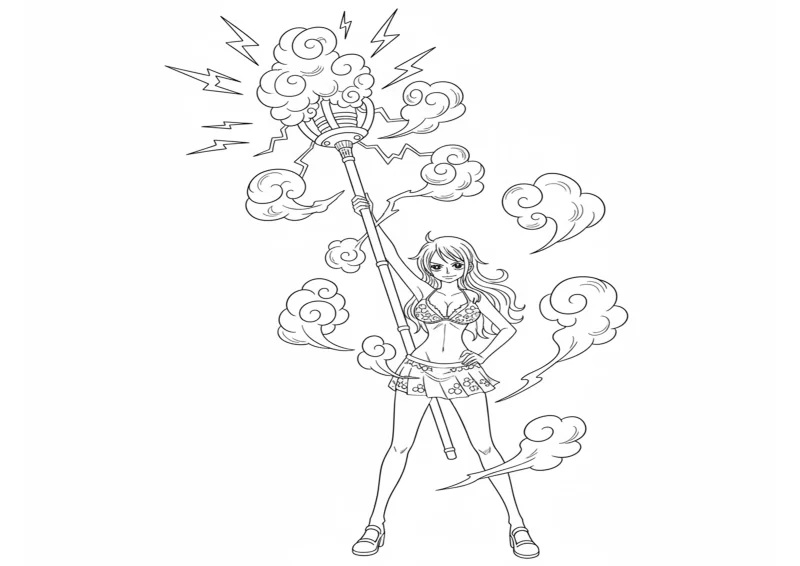 👒One PieceNami em pose de ataque, segurando o bastão Clima-Tact com nuvens e raios se formando ao redor.