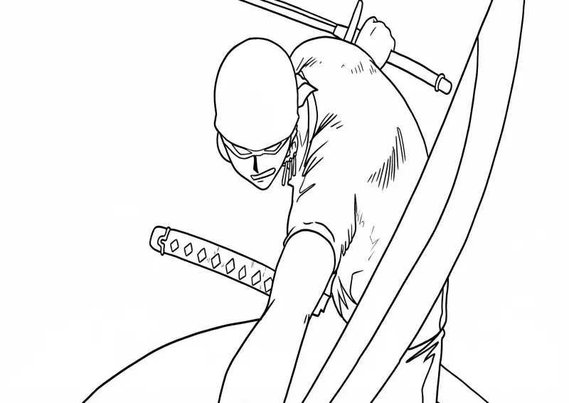 👒One PieceIlustração no estilo line art (preto e branco) de Roronoa Zoro, o espadachim dos Chapéus de Palha da série One Piece. O desenho destaca Zoro em um momento de alta tensão e seriedade, usando sua característica bandana (tenugui) na cabeça, o que sinaliza que ele está lutando a sério. Ele aparece em uma pose dinâmica de batalha, empunhando uma de suas katanas sobre o ombro enquanto carrega outra na cintura. O traço é limpo e ideal para imprimir e colorir.