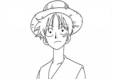 👒One PieceUm desenho em close-up focado no rosto de Monkey D. Luffy. A ilustração destaca uma expressão de curiosidade e surpresa leve, com os olhos bem abertos e redondos. Ele está usando seu icônico chapéu de palha, cujos detalhes de textura são visíveis. O traço é limpo e simples, ideal para quem quer praticar a colorização de tons de pele e expressões faciais de anime.