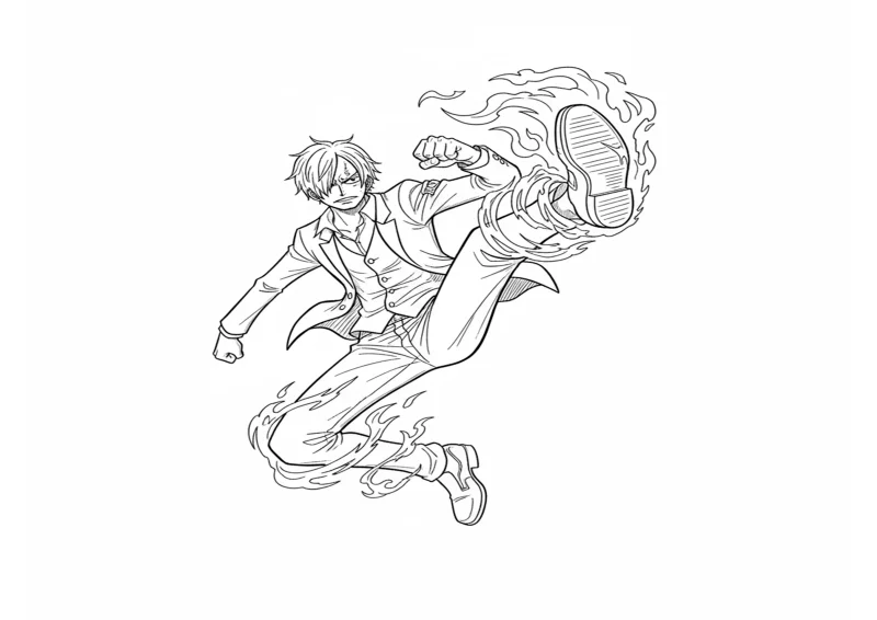 Sanji no ar, executando um chute poderoso com chamas saindo de sua perna.