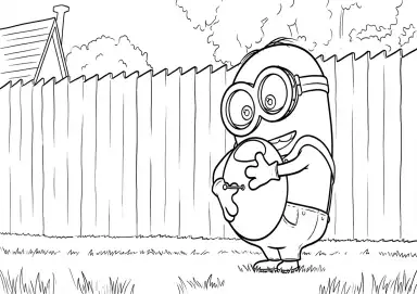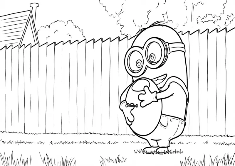 🤪Os MinionsDesenho detalhado em preto e branco para colorir. A cena retrata o personagem Stuart (Minion de um olho só) em um jardim, segurando e abraçando com carinho sua pequena nave espacial de estimação (pet). O fundo compõe o cenário com uma cerca de madeira e vegetação, criando uma imagem divertida e criativa para crianças pintarem.