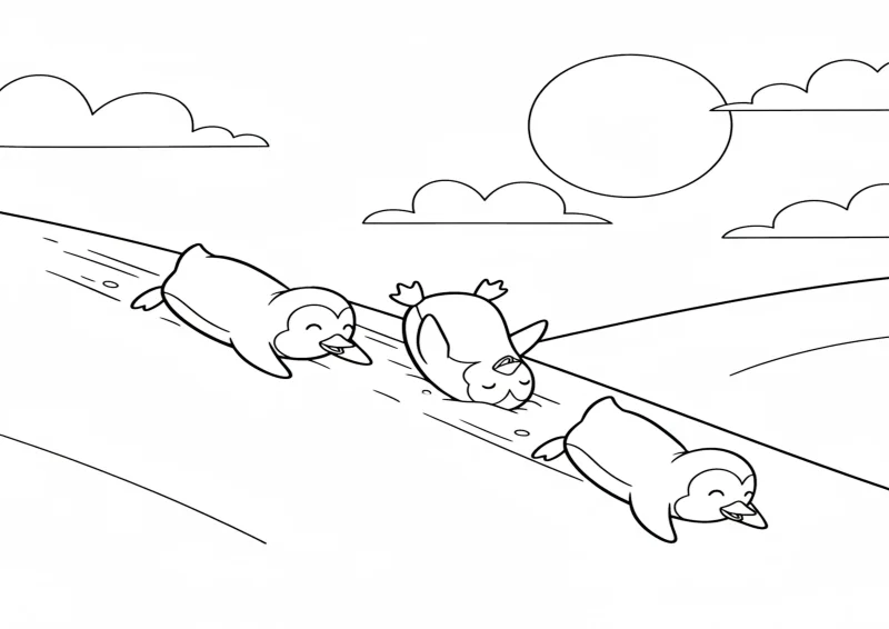🐧PinguimDois pinguins escorregam felizes numa colina de neve enquanto outro trava e fica de cabeça para baixo.
