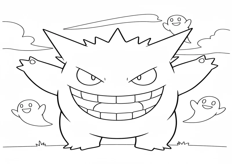 Gengar rindo com braços abertos, cercado de formas sombreadas engraçadas.