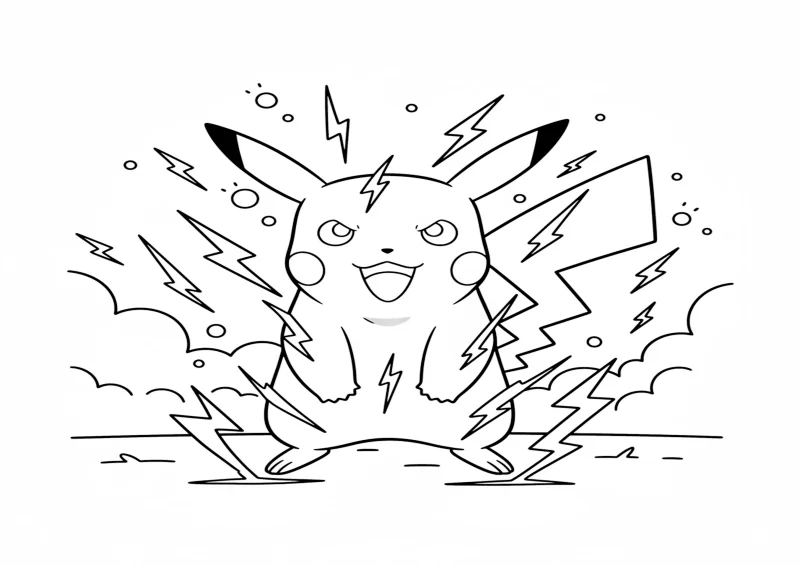 Pikachu em pé levantando a cauda, com raios saindo ao redor.