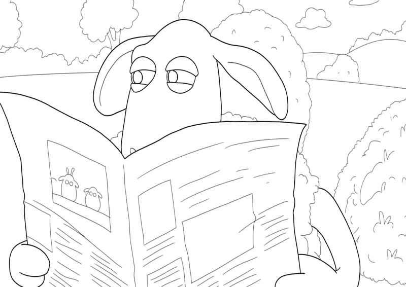🐑Shaun o CarneiroDesenho para colorir de Shaun o Carneiro lendo jornal no campo. Uma cena divertida e calma, perfeita para atividades educativas e criativas, ideal para imprimir e colorir com crianças fãs da série.