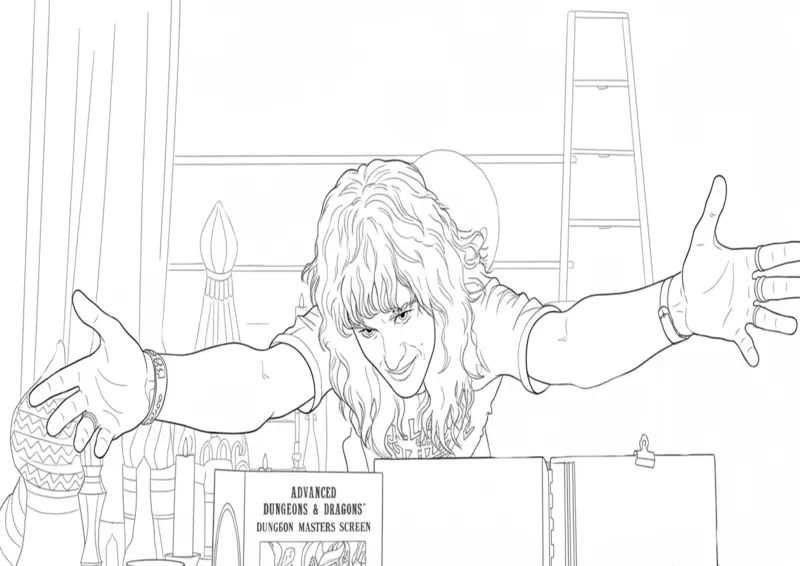 🩸Stranger ThingsDesenho para colorir do icônico personagem Eddie Munson, líder do Hellfire Club na 4ª temporada de Stranger Things. A cena mostra Eddie como Dungeon Master atrás do escudo de mestre de Advanced Dungeons & Dragons, capturando sua energia vibrante e carismática para fãs de RPG e da série.