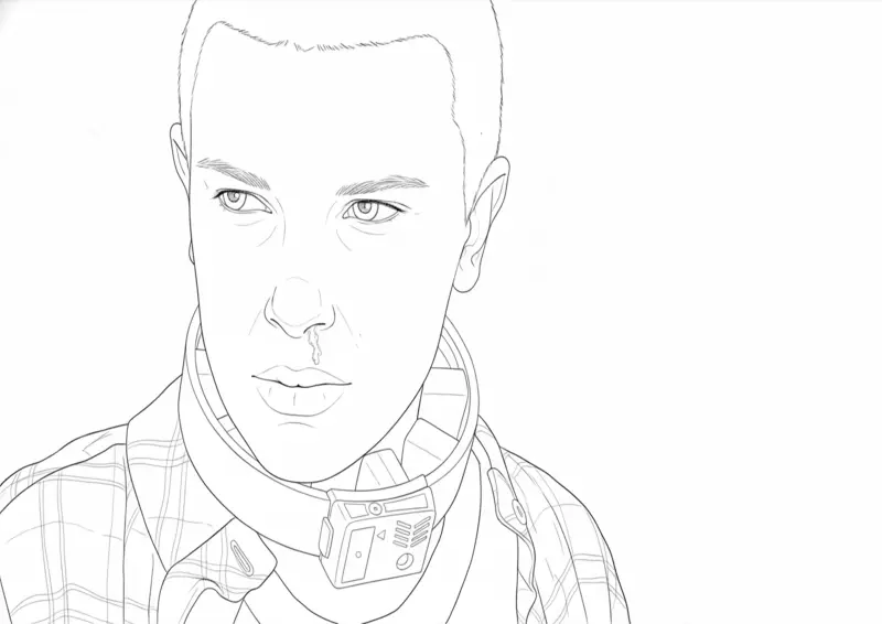 🩸Stranger ThingsDesenho para colorir da Eleven (Onze) durante os experimentos no Laboratório de Hawkins na 4ª temporada de Stranger Things. A arte detalha a personagem com o cabelo raspado, o colar inibidor de poderes e o característico sangramento nasal após usar suas habilidades telecinéticas. Perfeito para fãs que buscam ilustrações marcantes da protagonista.