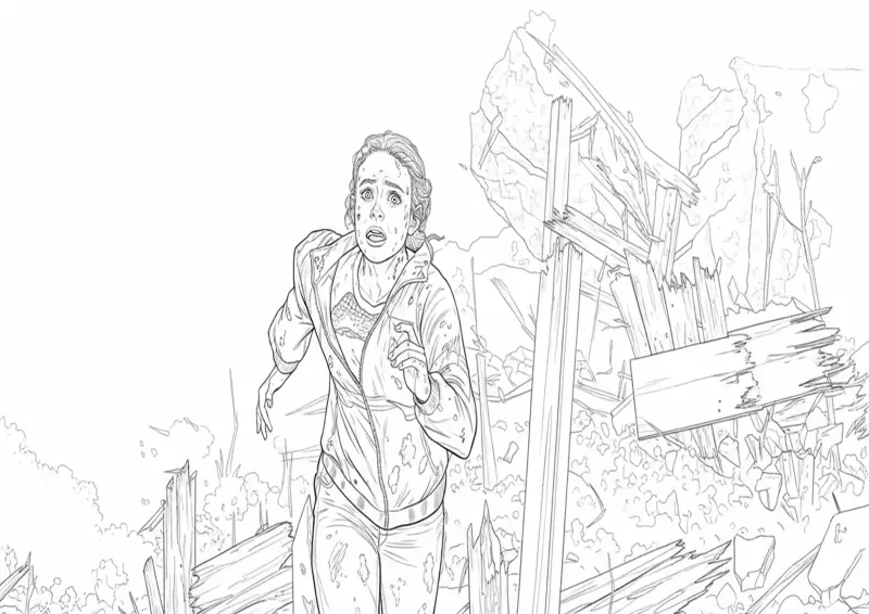 🩸Stranger ThingsDesenho para colorir da personagem Max Mayfield correndo desesperada em meio aos escombros da mansão Creel no Mundo Invertido. Uma cena intensa da 4ª temporada de Stranger Things que captura a coragem da personagem, ideal para fãs que buscam ilustrações de ação e suspense.