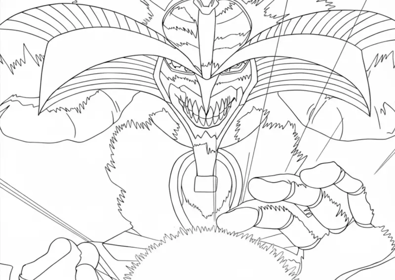 👁️Yu-Gi-OhDesenho para colorir focado no rosto e tronco de Exodia, o Proibido, o monstro mais poderoso de Yu-Gi-Oh!. Esta arte em line art destaca a expressão feroz do monstro e os detalhes de sua armadura egípcia. Perfeito para fãs que desejam colorir uma cena de invocação épica com alta fidelidade ao anime.