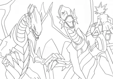 𓂀Yu-Gi-OhDesenho para colorir épico apresentando dois Dragões Brancos de Olhos Azuis (Blue-Eyes White Dragon) ao lado de seu mestre, Seto Kaiba. A arte em line art captura a escala massiva dos dragões e a imponência do duelista em sua plataforma de comando, ideal para fãs que buscam cenas complexas do filme e do anime Yu-Gi-Oh!.